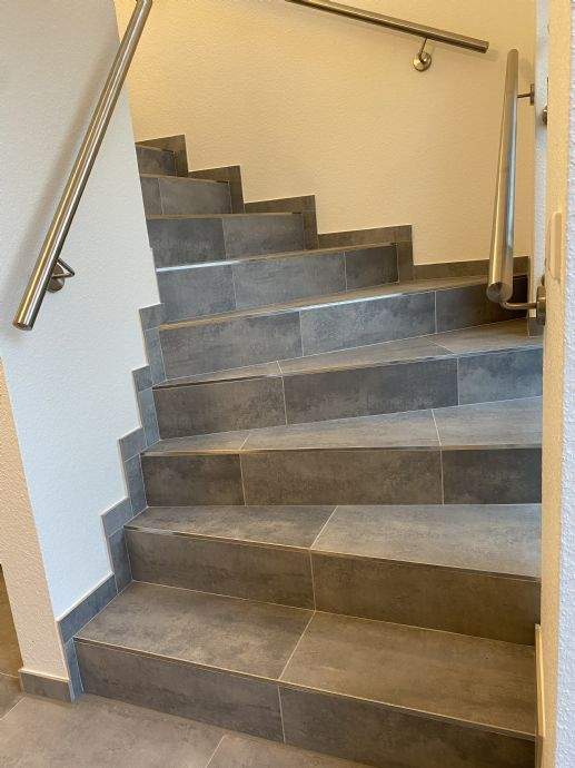 Die Balkone und Dachterrassen erhalten als Bodenbelag hochwertige Terrassenplatten in Holzoptik Anthrazit-Grau.